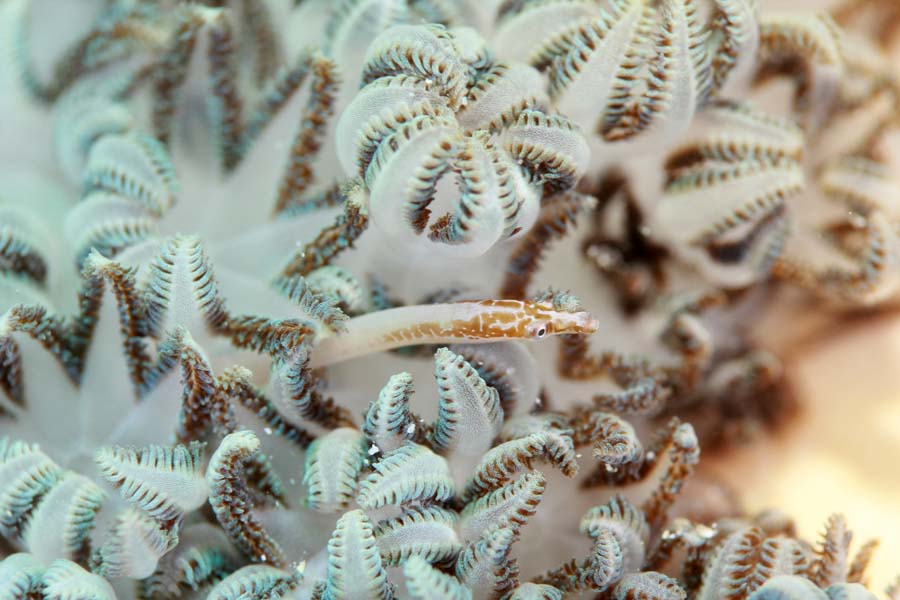 いわゆるヨウジウオの仲間かとは思うのだけれど、名前がハッキリしないようだ。「この魚の名前は?」とガイドさんに聞いたら「トモニョロ」だと教えてくれた。彼女(=トモさん)が見つけたので彼女自身でそう呼んでいるみたい。スポテッドキセニアパイプフィッシュという名前もあるらしいけどハッキリしないとのこと。