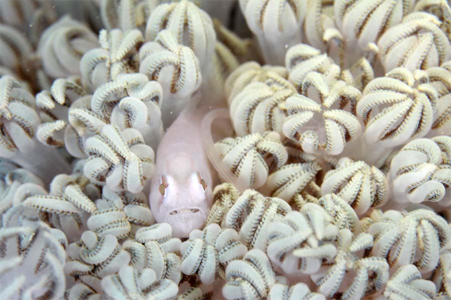 トゲトサカテッポウエビを撮っていたら何かがピョンっと跳ねてガイドさんの足にしがみついた。何だろうとシャッター切ったのが上のカット。黒いのはガイドさんのウェットスーツ太ももです。