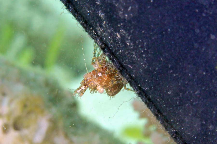 ユキンコボウシガニの雪ん子ちゃんことオガサワラカイカムリです。チャツボホヤをすっぽりと被ってコッチを睨んでます。
