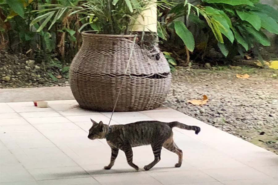 何でもと~ってもお盛んな雄ネコで、メスを見つけるやすぐさまいたしてしまって胎(はら)ませちゃうのでタマタマを取ってしまったんだそうな。それでもまだ悪さをするので、傷が塞がるまで繋いでいるんだとか。