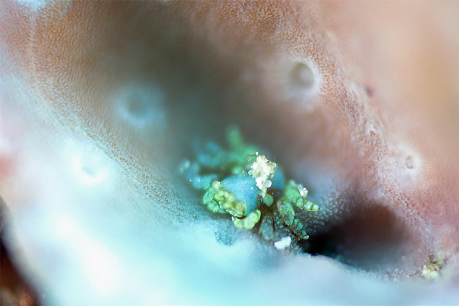 このカット、実はファインダーを覗く私の目には、当初イソギンチャクモエビしか視界に入っとらんかった。何カットかシャッターを切る内に、「ン? 左になんかいるゾ」と気付いた次第。ナデシコカクレエビの方が大きいというのに、そのスッケスケの身体のせいか目に入らんかった。(←ウソ。視力が悪いせい)